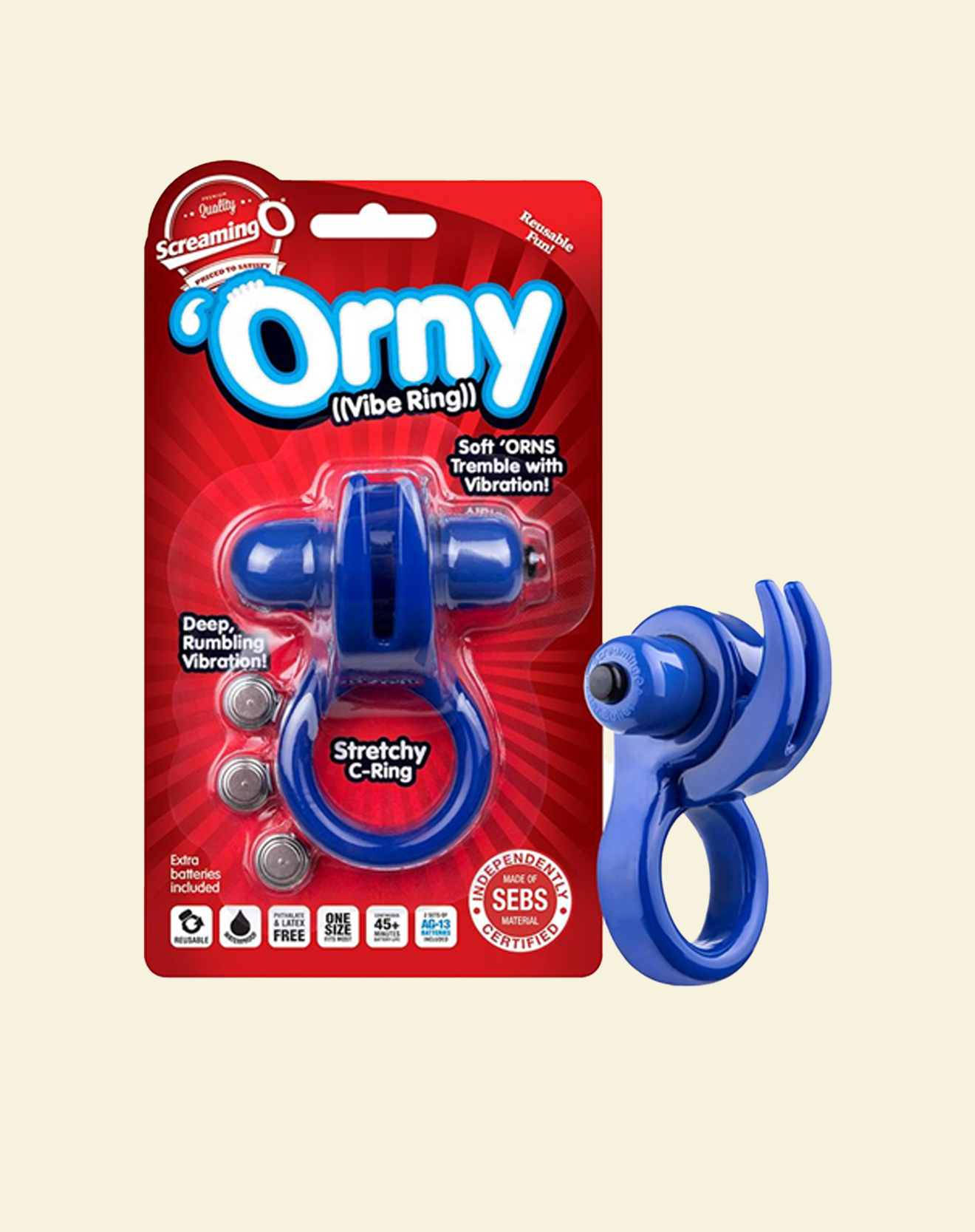 The ‘Orny is powered by the famous Vooom Bullet, a new low-pitch mini vibe that vibrates with a deep, rumbling sensation unlike anything you’ve ever felt. This one-size-fits-most cock ring has an inner diameter of 1.25 inches unstretched that is equipped with two soft, flexible 1.75 inch long, .8 inch wide horns that cradle the clitoris and tremble and flutter against every erogenous zone they touch. With the push of a button, the ‘Orny sends powerful vibration to their tips with 3 speeds plus pulsation all while providing an enhanced experience for him. Simply stretch the ring around the penis or both the penis and testicles with the vibrating “horns” positioned on top to assure the most effective experience. The ‘Orny Cock Ring is available in Blueberry, Grey and Red.